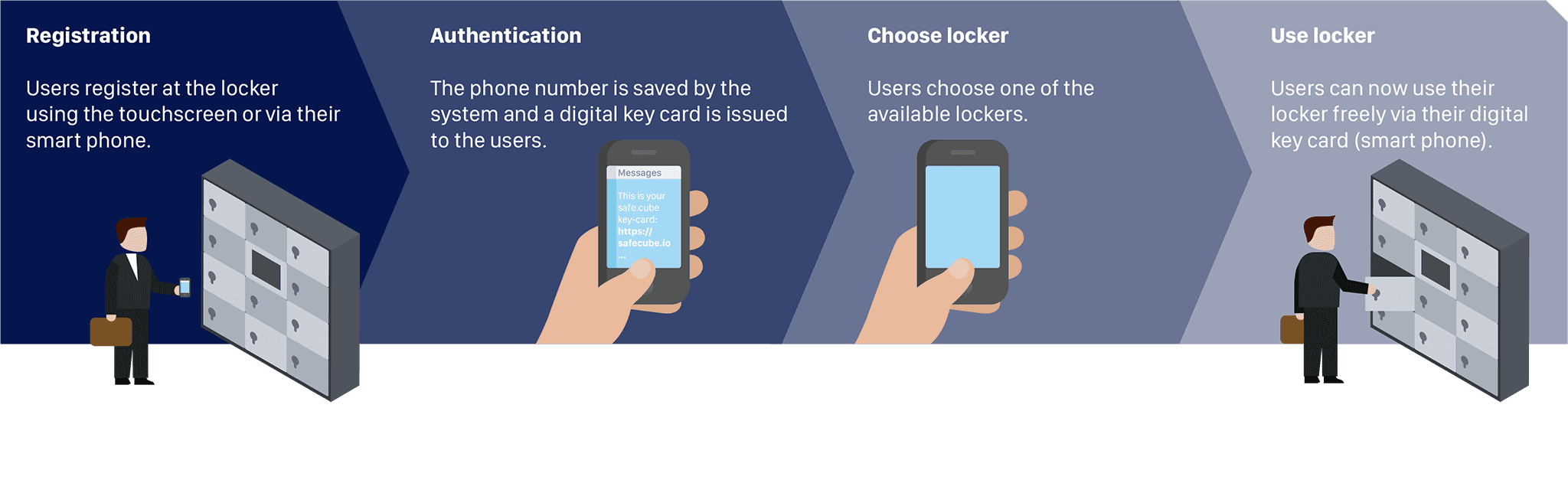 Users register directly at the SafeCube terminal using their telephone number or e-mail address. They receive a link to the SafeCube mobile website by text message. The lockers are reserved there, opened at the touch of a button and released again after use.